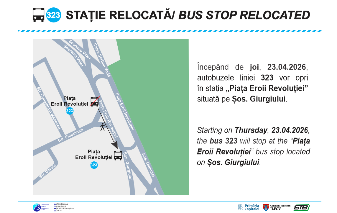 Începând de joi, 23.04.2026, autobuzele liniei 323 vor efectua stația „Piața Eroii Revoluției” de pe sensul spre „Zețarilor” în alveola amplasată după intersecția cu Bd. Pieptănari și nu vor mai opri în stația de pe amplasamentul actual. Totodată, ca urmare a începerii lucrărilor de reabilitare a căii de rulare a tramvaielor de pe Bd. Gheorghe Șincai, vehiculele liniei 323 circulă pe carosabil pe această arteră și efectuează la bordură […]