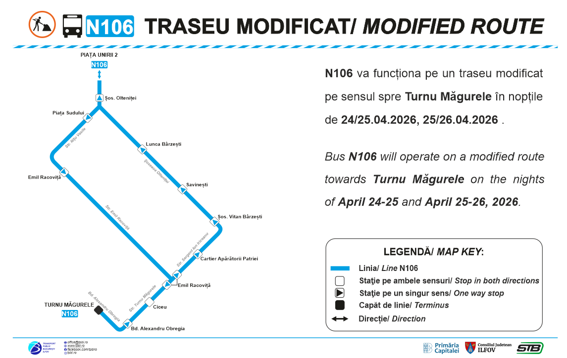 Linia de noapte N106 va funcţiona pe un traseu modificat pe sensul spre capătul „Turnu Măgurele”, în nopţile de vineri spre sâmbătă şi sâmbătă spre duminică, în intervalul orar 23:00 – 5:00, a anunţat, joi, Asociaţia de Dezvoltare Intercomunitară pentru Transport Public Bucureşti – Ilfov (TPBI). Măsura a fost luată ca urmare a restricţiilor de […]